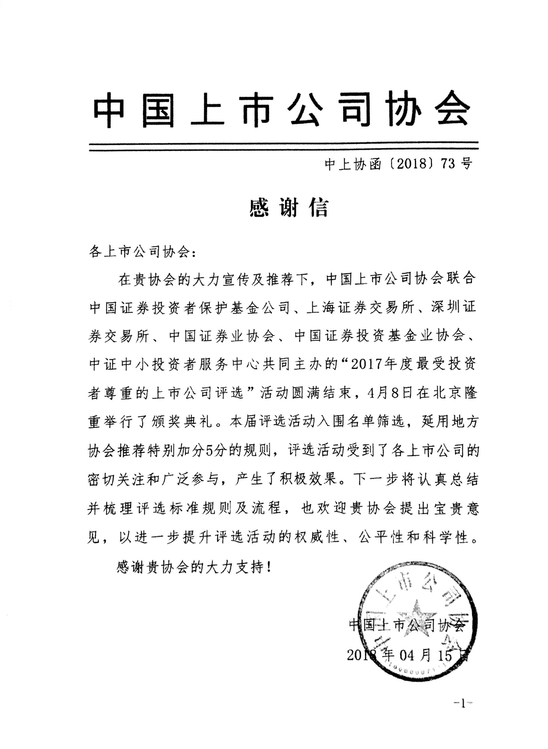 中國上市公司協(xié)會致我會感謝信