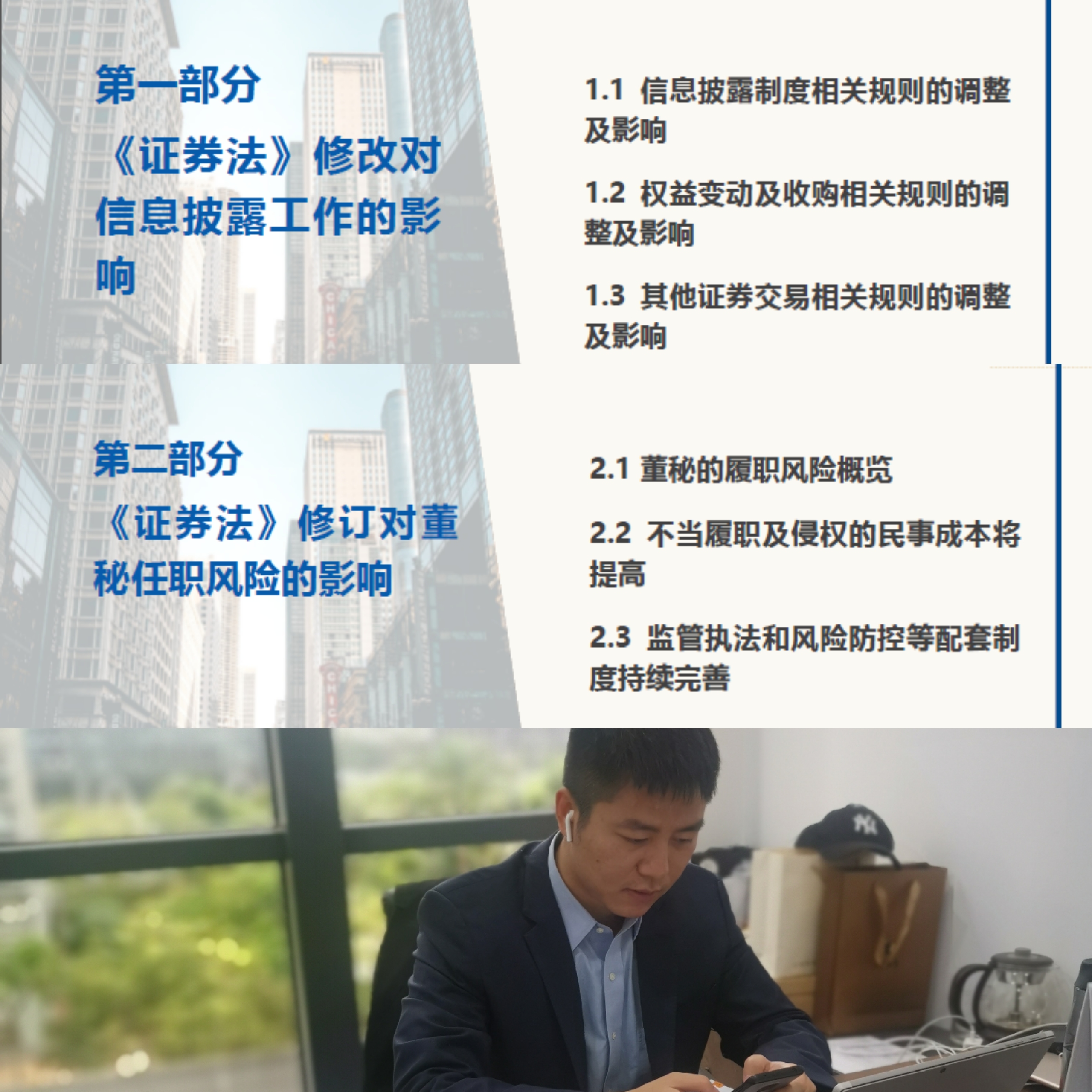 首先,由他山咨詢總經(jīng)理李詩夢做《新<證券法>對上市公司信披的影響及應(yīng)對建議》專題講座。講座圍繞新《證券法》修改對信披工作的影響、董秘任職風險等做了詳盡解讀,并對高管履職風險應(yīng)對注意要點和線上參會人員做了充分交流討論。