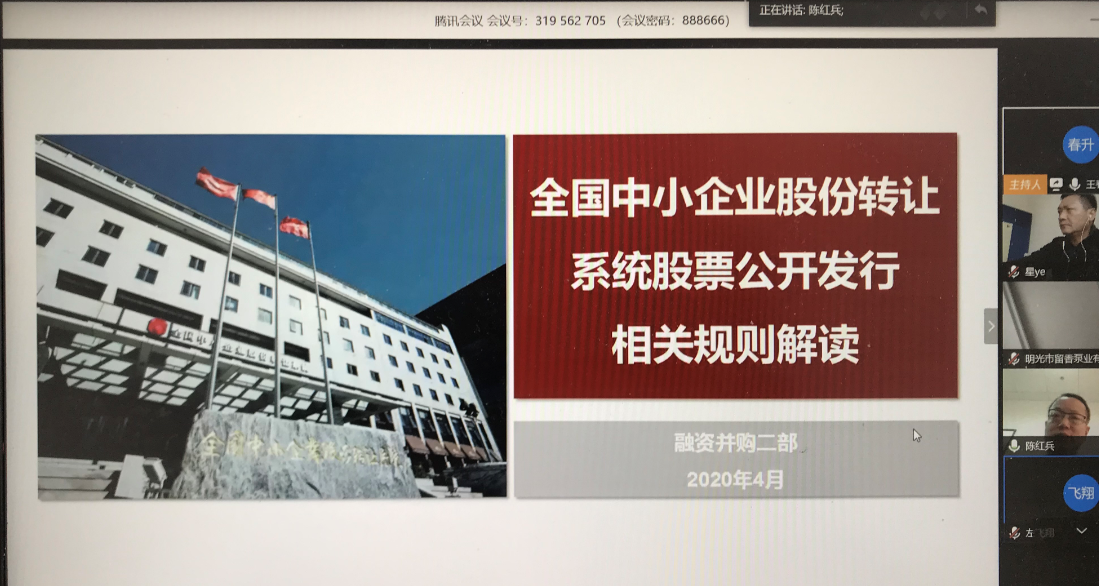 時(shí)值設(shè)立精選層在內(nèi)的新三板深化改革舉措正如火如荼鋪開,為進(jìn)一步幫助安徽新三板公司及時(shí)準(zhǔn)確了解新三板改革動(dòng)態(tài),根據(jù)安徽證監(jiān)局工作部署,4月8日,我會(huì)配合舉辦了新三板精選層制度規(guī)則專題培訓(xùn)活動(dòng)。協(xié)會(huì)新三板工作委員會(huì)委員及安徽110家掛牌公司以及16個(gè)地市的金融局,近200人通過在線形式參加培訓(xùn)。