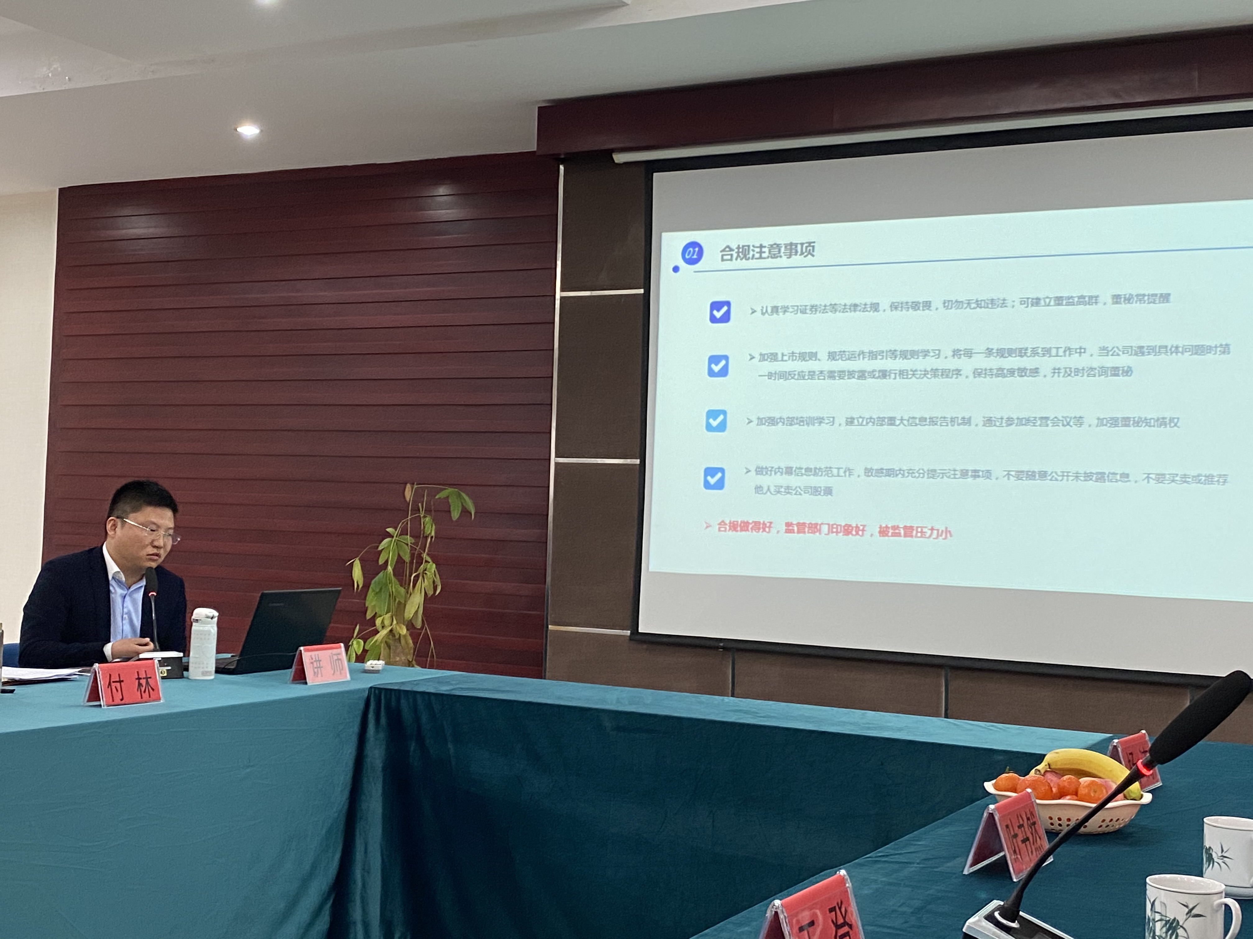本次“高管講堂”一是邀請安徽證監(jiān)局公司處葉書然圍繞新《證券法》和《刑法》修正案(十一)、上市公司規(guī)范治理、董監(jiān)高履職規(guī)范、違規(guī)處罰等作《推進(jìn)公司治理,提高上市公司質(zhì)量》專題講座;二是由協(xié)會證代工作委員會主任委員、科大國創(chuàng)證代楊濤圍繞上市公司年報編制披露、合規(guī)經(jīng)營、資本運作做經(jīng)驗分享;三是組織華業(yè)香料全體董監(jiān)高現(xiàn)場集體學(xué)習(xí)上市公司治理準(zhǔn)則,舉行上市公司規(guī)范運作承諾書的簽署儀式。