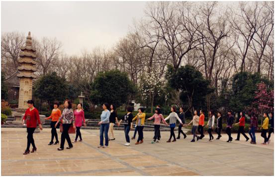 孫愛萍老師帶領(lǐng)與會代表在三塔廣場做健康有氧運動操